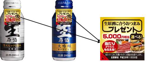 本キャンペーンは、「生原酒と贅沢なひと時を!プレミアムなおつまみプレゼントキャンペーン」と題して、商品に貼付している2層のシールをめくり、当たりがでれば、郵便はがきに当たりくじを貼ってご応募いただきますと、グルメギフトメニューカードを送付いたします。その中から、お好きな商品(5,000円相当)を1つ選んでご注文いただけます。同商品の特長でもある「火入れ(加熱殺菌)」や「割り水(希釈)」を一切行っていない生原酒が持つ日本酒本来の鮮度感あふれる贅沢な香りと美味しさを、プレミアムなおつまみと一緒にお楽しみいただけます。
